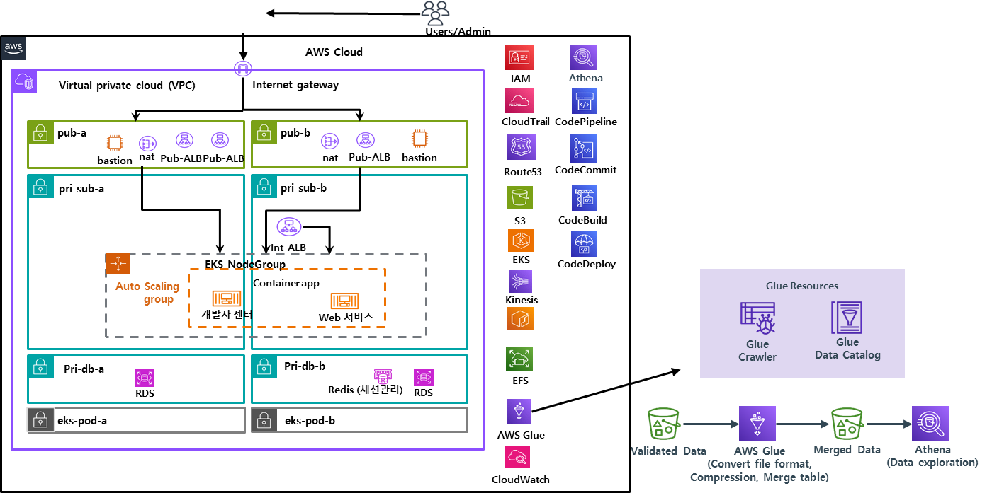 퍼블릭 클라우드에서는 세계시장 점유율은 물론 국내시장 점유율에 대해 압도적인 퍼블릭 클라우드인 AWS를 사용하고자 했습니다. AWS는 200개 이상의 검증된 서비스를 폭넓게 활용 가능하며 구축 지원을 합니다. 또한 마켓플레이스를 통해 글로벌 상품화가 가능하며, 보안적인 측면에서도 뛰어나고, 계정의 운영, 위험 감사, 거버넌스 및 규정 준수를 지원하기도 합니다.